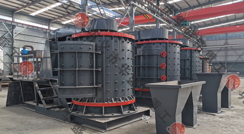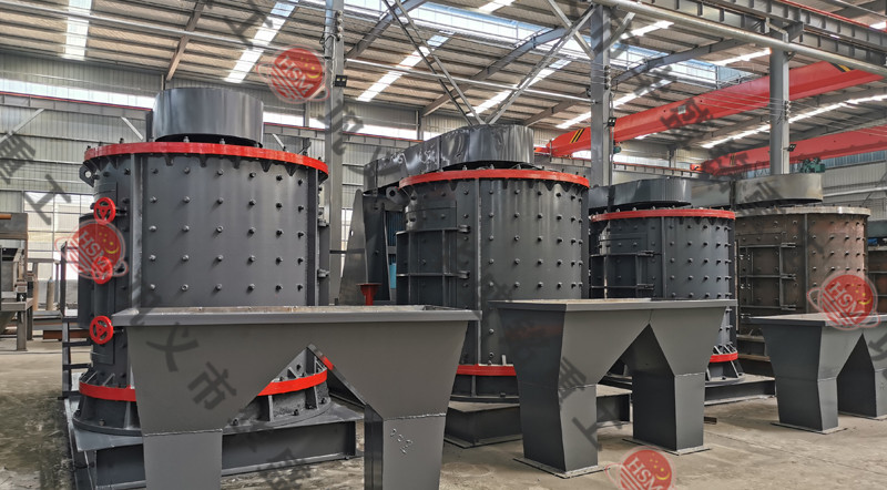 物料由機器上部垂直落入高速旋轉的葉輪內,在高速離心力的作用下,與另一部分以傘狀形式分流在葉輪四周的物料產生高速撞擊與粉碎,物料在互相撞擊后,又會在葉輪和機殼之間以物料形成渦流多次的互相撞擊、摩擦而粉碎,從下部直通排出,形成閉路多次循環(huán),由篩分設備控制達到所要求的成品粒度。